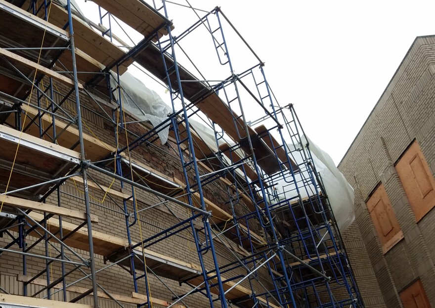 If you've been wondering about the white facing going up along the Union Terminal facade, we have an answer for you."The aluminum windows in the front of the building are being restored in place," says Nick Cates of GBBN Architects. "They're in the process of taking all the glass out so that they can clean the frames."