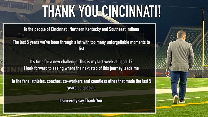“To the people of Cincinnati, Northern Kentucky and Southeast Indiana: The last five years we’ve been through a lot with too many unforgettable moments to list. It’s time for a new challenge. This is my last week at Local 12. I look forward to seeing where the next step of this journey leads me. To the fans, athletes, coaches, co-workers and countless others that made the last 5 years so special, I sincerely say thank you.”