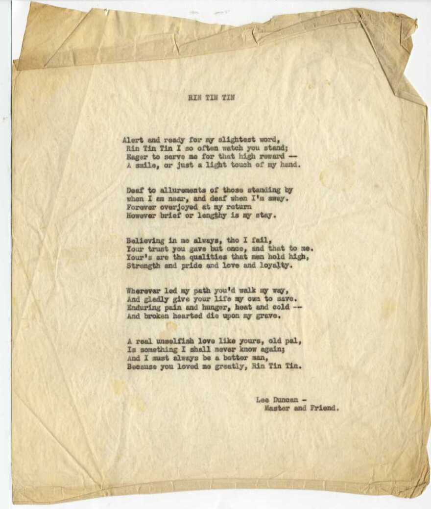 Duncan wrote a poem called "Rin Tin Tin," which captures some of what he admired so much about his dog. It's reproduced here as it appears in the original, which you will see in a photo below.