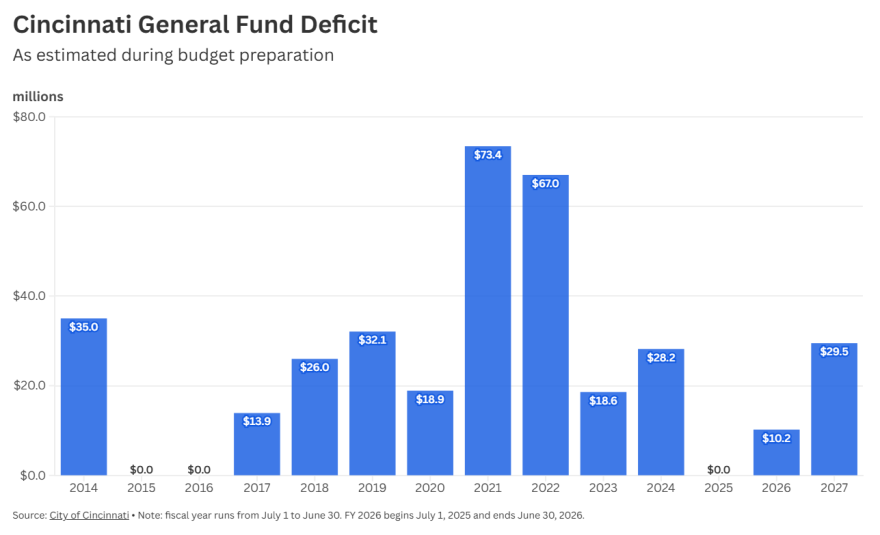 Cincinnati has faced a general fund deficit for 10 of the last 13 fiscal years. Federal pandemic stimulus from the American Rescue Plan Act filled significant funding gaps between 2021 and 2025.
