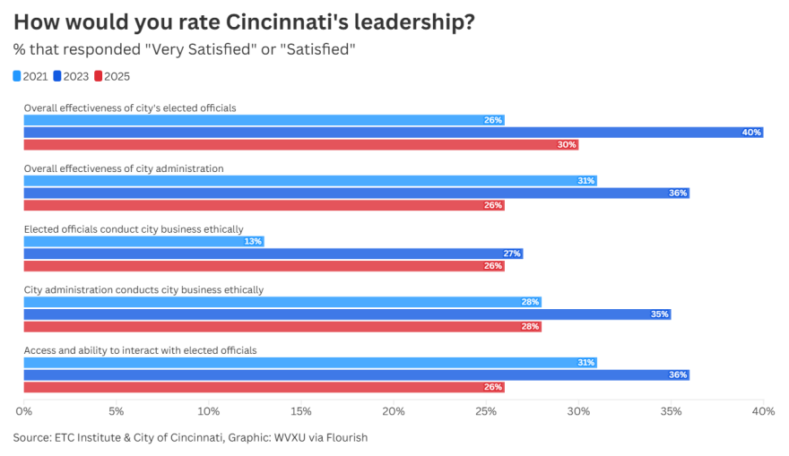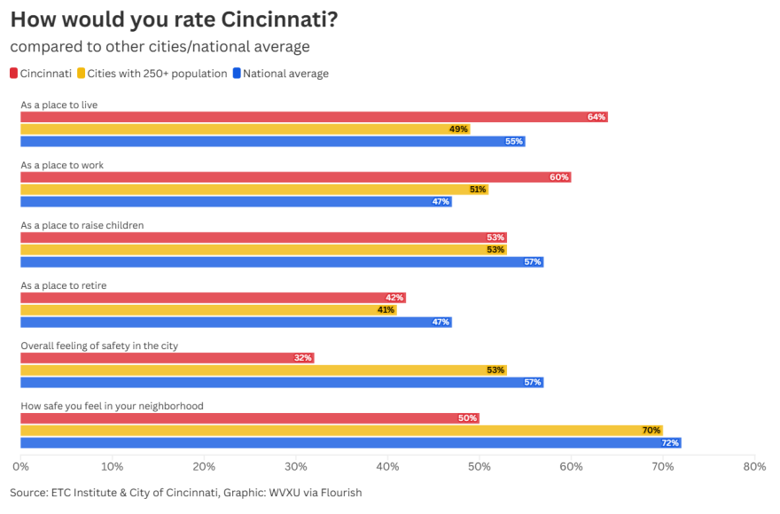 Despite significant changes among local residents, Cincinnati still ranks higher than peer cities and the national average in some metrics, like satisfaction with the city as a place to live and work.