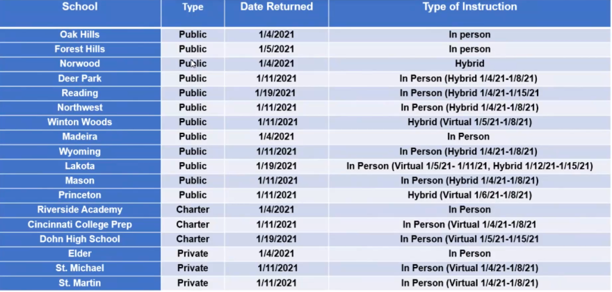 In December, it was determined the city of Cincinnati would need to average 40 new cases of COVID-19 per 100,000 people per day for blended learning to resume. As of Jan. 14, Cincinnati is averaging 66 new cases, much higher than what is desired. The decision to return to blended learning comes as COVID cases continue to rise in the city and across the county.