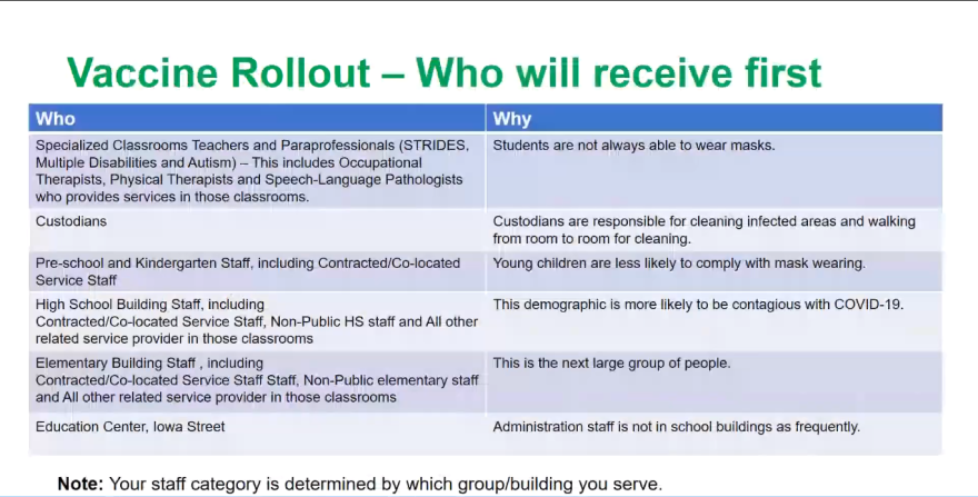 Certain staff members will receive the Moderna vaccine first, including custodians and specialized classroom teachers.